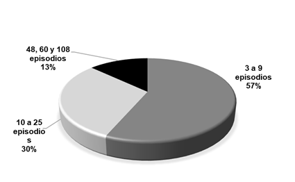 · Cantidad de episodios por producción: a) episodio único, b) 2 a 9 episodios, c) 10 a 25 episodios y e) más de 26 episodios.
