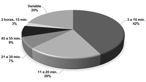 · Duración promedio de episodios: a) duración variable, b) de 3 a 10 minutos, c) de 11 a 20 minutos, d) de 21 a 30 minutos, e) entre 31 y 60 minutos, f) más de una hora.