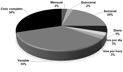Finalmente, si se pone el foco en la periodicidad de publicación de episodios nuevos, se puede concluir que el 35% de los ciclos de podcasts tiene un ritmo variable en la actualización de los contenidos; lo que torna imprevisible la predeterminación de continuidad de cada propuesta.