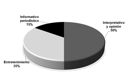 A partir de analizar y caracterizar el conjunto de las 40 propuestas de podcasts se evidencia que el 50% de las producciones (20) se inscribe en el género interpretativo y de opinión. Asimismo, un 35% de las propuestas (14) persiguen finalidades vinculadas a la recreación y distención por lo que se registran en el género de entretenimiento. En un tercer agrupamiento se inscriben aquellos podcasts que claramente tienen un perfil informativo periodístico, y representan el 13% del total.