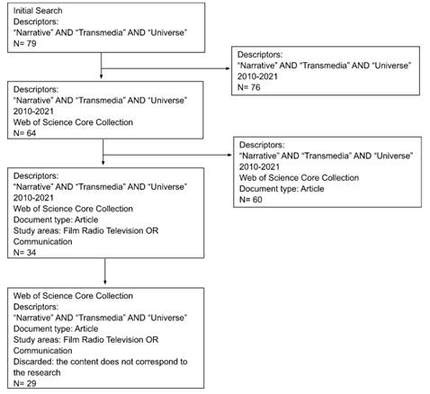 Este estudio presenta una revisión sistemática basada en una búsqueda booleana de los artículos publicados en revistas incluidas en la base de datos Web of Science Core Collection. La búsqueda se ha basado en las palabras clave ‘transmedia’ AND ‘narrative’ AND ‘universe’, lo que ha arrojado un total de 79 resultados. A continuación, se han descartado todos aquellos que no estaban dentro de las categorías ‘Communication’ y ‘Film Radio Television’, que no eran artículos o no estaban clasificados como tal, o no pertenecían a la década 2010-2021. Se ha seleccionado este filtrado de ambos campos de conocimiento, porque son los que se ajustan a la perspectiva de esta investigación, centrada en la comunicación audiovisual, la cinematografía, el periodismo y la publicidad, eminentemente.