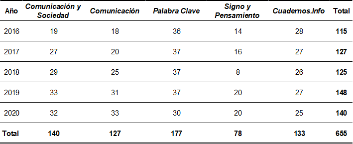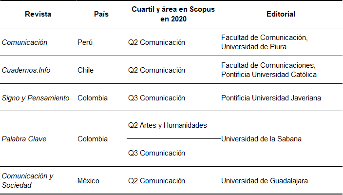 Para la elección de revistas indexadas allí, se tuvieron en cuenta los siguientes criterios: que estuvieran catalogadas como revistas de comunicación, que fueran de acceso libre en formato digital, publicadas en español y que, durante 2020, hubieran sido las mejores indexadas (tres primeros cuartiles) de las revistas latinoamericanas de comunicación. Cabe tener en cuenta que, cuando se llevó a cabo esta investigación, dieciocho revistas de América Latina contaban con indexación en Scopus. De ese total, once se ubicaban en los tres primeros cuartiles. Asimismo, se excluyeron las ediciones indexadas en Scopus provenientes de Brasil, que mayoritariamente son publicadas en portugués. En referencia al trabajo de Siles et al. (2019), esta decisión se justifica por dos motivos: por un lado, el estudio se puntualizó en artículos publicados en el mismo idioma (castellano) del grupo de trabajo para así agilizar y asegurar acuerdos sobre las categorías de análisis (Krippendorff, 2004); por otro lado, la importancia que ha adquirido la investigación en comunicación en Brasil (Siles et al., 2019) ocasionaría un desbalance en la muestra: de las once revistas de América Latina que se ubican en los tres primeros cuartiles en el ranking Scopus, seis son editadas en Brasil.
