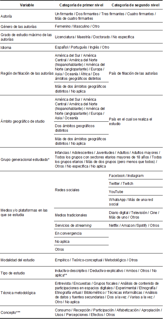 Para analizar los artículos, se diseñó un libro de códigos. Para su elaboración, fueron vitales los trabajos anteriormente mencionados de Barranquero y Angel (2021), Piñeiro-Naval y Mangana (2019), Piñeiro-Naval y Morai (2019) y Siles et al. (2019). El libro contó con variables formales y variables temáticas o de contenido (Igartua, 2006). La configuración de estas se logró luego de un acercamiento inductivo al objeto de estudio, en diálogo con un trabajo deductivo a partir de lo abordado con los estudios inspiradores anteriormente mencionados (Barranquero y Angel, 2021; Piñeiro-Naval y Mangana, 2019; Piñeiro-Naval y Morai, 2019; Siles et al., 2019). Con todo esto, las variables abordadas fueron: