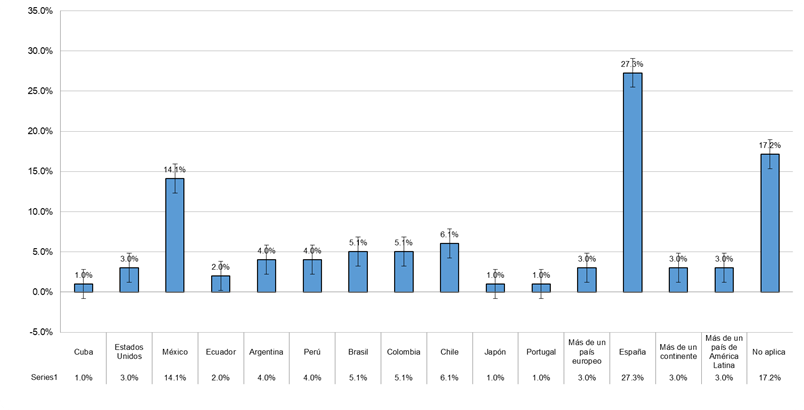 Además, del total de primeros firmantes, el 42% (n=42) tiene su lugar de trabajo en la América Latina de habla hispana. De ese total, el 40% (n=17) está afiliado a universidades de México, el 22% (n=9) está adscrito a universidades colombianas, el 15% (n=6) a chilenas, el 9% (n=4) a argentinas, el 7% (n=3) a peruanas, el 5% (n=2) a ecuatorianas y el 2% (n=1) a cubanas.