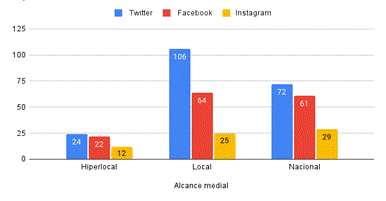 Según los datos analizados, se destaca que los medios locales junto a los hiperlocales suman una mayor participación en la cobertura en las plataformas de Twitter, Facebook e Instagram. Este hallazgo resalta la importancia y el papel clave en la difusión de información sobre temas de relevancia local de este tipo de medios y las plataformas de redes sociales. Además, cabe destacar que tanto los medios locales como los hiperlocales mantienen una participación sostenida en el tiempo en la cobertura de estos eventos, lo que sugiere su compromiso continuo con la información de interés para sus comunidades.