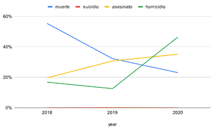 Para identificar cómo describieron los medios la muerte de los activistas, se analizó la frecuencia de aparición de cinco palabras candidatas: “muerte”, “suicidio”, “asesinato”, “homicidio” y “femicidio”. Utilizamos un script Python y la librería Spacy (https://spacy.io/) para cuantificar el número de apariciones de cada una de estas palabras. Se agrupan los resultados por caso noticioso y por año entre 2016 y 2020. Para comparar la evolución del uso de palabras en el tiempo, calculamos por cada palabra un porcentaje de uso que corresponde al número de apariciones de la palabra dividido por el número total de apariciones de las palabras candidatas. Este porcentaje nos permite evaluar cómo los periodistas deciden referirse al caso noticioso, eligiendo en ciertos casos un término neutro como “muerte”, o un término más comprometido, enfatizando el crimen (“asesinato”, “homicidio”, “femicidio”), o al contrario priorizando la pista del “suicidio”. Este dato nos permitirá ver si (a) los medios fomentan sensacionalismo con los casos; (b) invisibilizan la muerte de los activistas o (c) se adaptan palabras para definir las causas de muerte según los resultados en el avance de las investigaciones forenses.