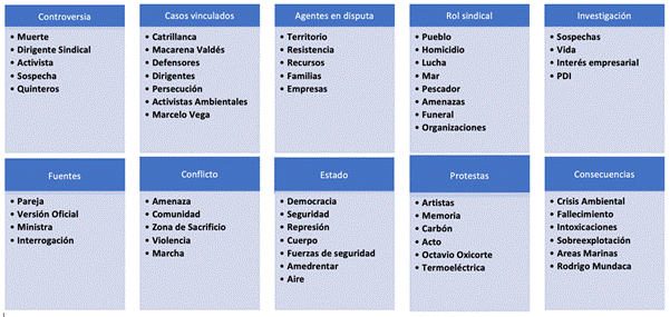 El quinto tópico describe un enfoque pericial sobre las causas de muerte y el proceso investigativo, mientras que el sexto resalta eventos relacionados con el caso, como la actuación de la cantante Denise Rosental en el Festival de Viña del Mar con una polera de Macarena Valdés y la conexión del caso con el de Berta Cáceres en Honduras en varios conversatorios realizados en universidades. Por último, aunque menos frecuente, se mencionan conceptos vinculados al ‘extractivismo’ y la lucha por el ‘agua’ debido a un ‘Proyecto Hidroeléctrico’, incluyendo la palabra mapudungun ‘lagmien’, que significa ‘hermana’ y se utiliza para referirse respetuosamente a las mujeres mapuche.