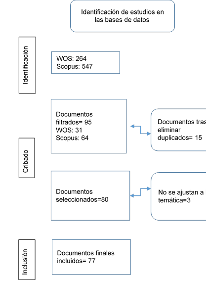 Para llevar a cabo la revisión bibliográfica actual, se optó por consultar las bases de datos reconocidas a nivel académico, Web of Science (WoS) y Scopus, dada su amplia aceptación y prominencia en el ámbito académico (Torres-Toukoumidis et al., 2021). Se aplicó un filtro durante la búsqueda para incluir únicamente documentos de tipo artículo científico, se seleccionó tanto el inglés como el español como idiomas pertinentes para la investigación.