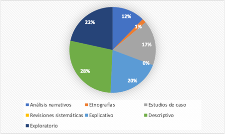 El tipo de diseño más comúnmente empleado revela que una parte significativa de las investigaciones busca comprender las características del fenómeno estudiado, en donde se detallan minuciosamente los aspectos que lo constituyen (Lafuente Ibáñez y Marín Egoscozábal, 2008), es decir, se dedica a la descripción del acontecimiento. Por ejemplo, Pessoa et al. (2023), se basan en la recopilación y análisis de datos cuantitativos mediante un cuestionario administrado a una muestra de conveniencia de estudiantes universitarios en el noreste de Brasil. Su objetivo es evaluar la prevalencia del uso de Instagram como herramienta para adoptar comportamientos relacionados con la salud y el bienestar, además de comprender las asociaciones entre los patrones de uso y las variables sociodemográficas. El diseño adoptado es de naturaleza descriptiva, enfocado en delinear las características y conductas de una población específica en un momento dado.