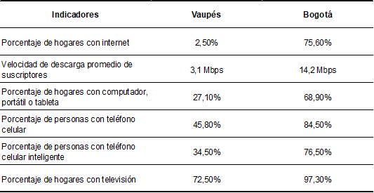 La Tabla 1 presenta algunas de estas estadísticas que encontramos relevantes. En una comparación, se evidencia que las tecnologías relacionadas con las comunicaciones y la información han avanzado en el país y se han ido extendiendo en, por ejemplo, casi la totalidad de Bogotá, ciudad capital de Colombia. No obstante, las cifras son significativamente diferentes en el departamento del Vaupés, que tiene grandes retos para el acceso a estas tecnologías que en el centro del país, en cambio, ya son tan comunes y asequibles.