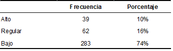 Como se muestra en la Tabla 1, el 88% de los pobladores encuestados tiene un nivel bajo de confianza en los anuncios publicados por las organizaciones gubernamentales del Perú. Al no registrarse este vínculo entre pobladores y las organizaciones, es poco probable que las personas sigan las recomendaciones para evitar el contagio, ya que perciben que los mensajes carecen de credibilidad.
