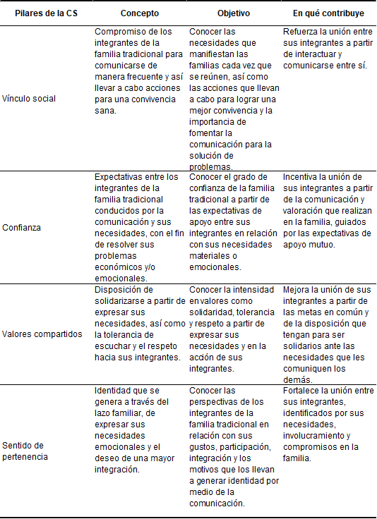 En el segundo pilar (confianza), el apoyo que reciben los integrantes es vital para alimentar la confianza expresando sus necesidades emocionales, ser escuchados, recibir consejos y ánimos. Realizar actividades juntos, como salir de paseo o de compras y cocinar, une a las familias. La comunicación fortalece la confianza en la esposa y el esposo y su relación con los hijos, lo que propicia un ambiente de felicidad y de emociones positivas. En el tercer pilar (valores compartidos), el amor es el valor más importante para la mamá, papá e hijos. La solidaridad en las familias es consecuencia de expresar sus necesidades, tener tolerancia para escuchar y ser escuchados y transmitir respeto a sus integrantes. Por último, en el cuarto pilar (sentido de pertenencia), la familia representa el espacio para socializar e interactuar, compartir experiencias y necesidades, es el refugio para los hijos, el respeto y la felicidad de sus integrantes, la confianza para expresar sus emociones, el apoyo mutuo para superar adversidades y mayor unión. La identidad se genera por todas las actividades y acciones que realizan en conjunto.
