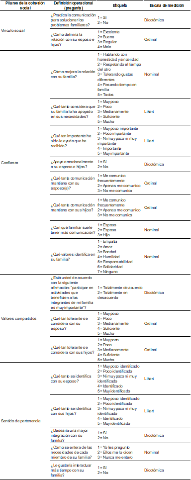 La Tabla 2 muestra los pilares de la cohesión social, definición operacional, etiqueta y tipo de escala, con la finalidad de valorar la participación de los miembros de las familias tradicionales a partir de su interacción y comunicación.