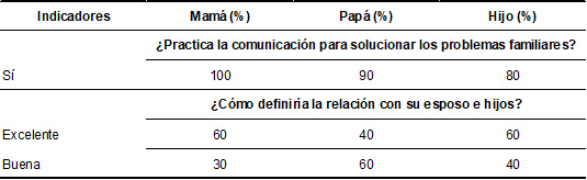 Posteriormente, desde el aspecto de apoyo emocional, el 100% de las mamás, el 90% de los papás y el 100% de los hijos mencionaron apoyarse emocionalmente. Este tipo de resultados obedece a la comunicación que existe en la familia. Por último, las mamás indicaron que tienen la misma comunicación con su esposo e hijos (80%), los papás con su esposa (90%), y los hijos con su mamá (Tabla 5).