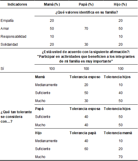 Está estructurado en seis reactivos: dos en formato de pregunta abierta y cuatro preguntas cerradas en escala nominal (1), dicotómica (1) y ordinal (2). En este sentido, la primera pregunta que se planteó fue: ¿qué valores identifica en su familia? El 50% de las mamás, el 70% de los papás y el 50% de los hijos respondieron que el valor que identifican en su familia es el amor.